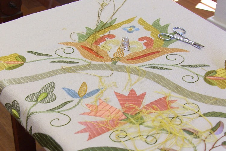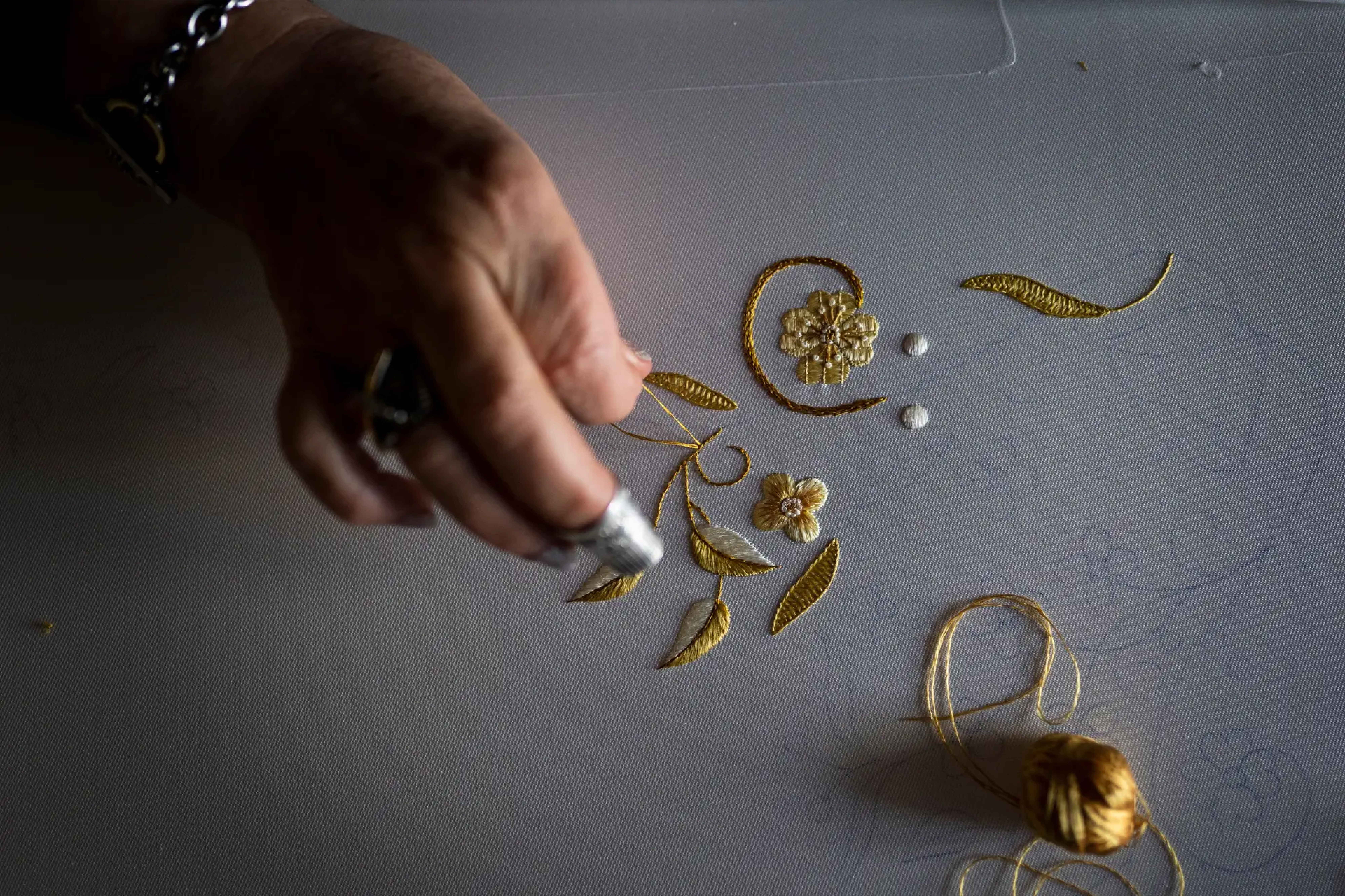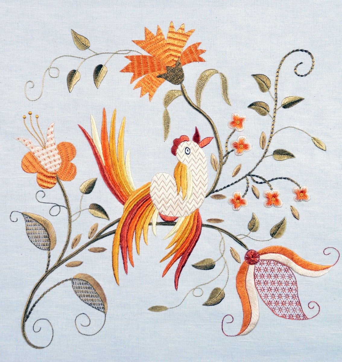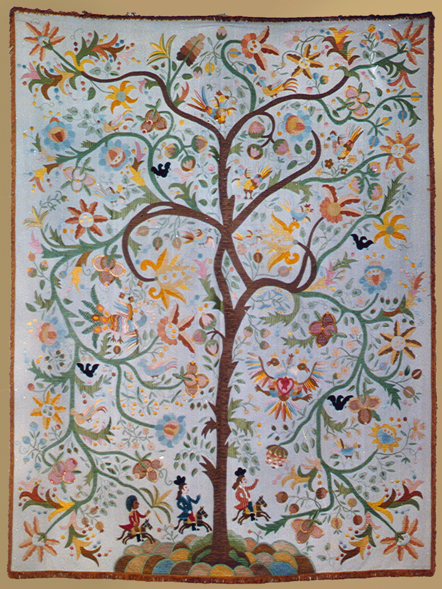 A técnica mais característica do Bordado de Castelo Branco é o ponto largo, também conhecido como ponto frouxo. Consiste na aplicação de fios de seda natural pouco torcidos, que permanecem soltos sobre o linho, criando um brilho subtil e uma textura única. Este modo de bordar exige grande precisão e controlo do fio, pois cada ponto deve manter-se uniforme e repousar suavemente sobre o tecido. O linho que serve de base às colchas provinha tradicionalmente do trabalho doméstico, sendo fiado e tecido nas próprias casas. A sua resistência, aliada à tonalidade clara e à textura natural, fazia dele um suporte ideal para receber a seda colorida. As cores, obtidas muitas vezes a partir de pigmentos vegetais, variavam entre tons quentes e frios, resultando numa paleta harmoniosa e facilmente reconhecível. As colchas eram constituídas por panos estreitos de linho cosidos entre si e guardavam um papel importante nas cerimónias familiares, sobretudo nos casamentos, simbolizando prosperidade, continuidade e união. |